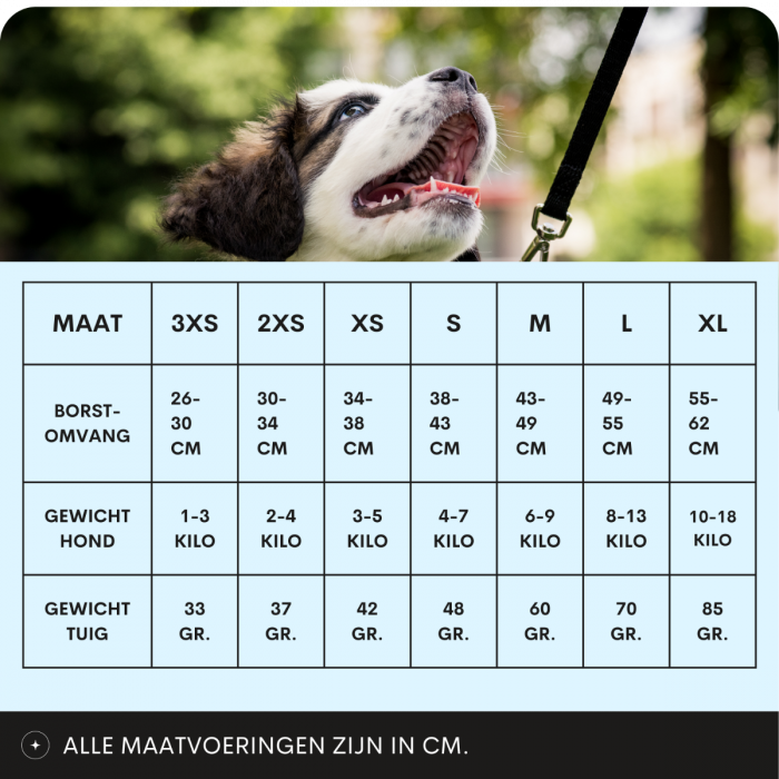 | Maat | Borstomvang | Gewicht hond | Gewicht tuig |